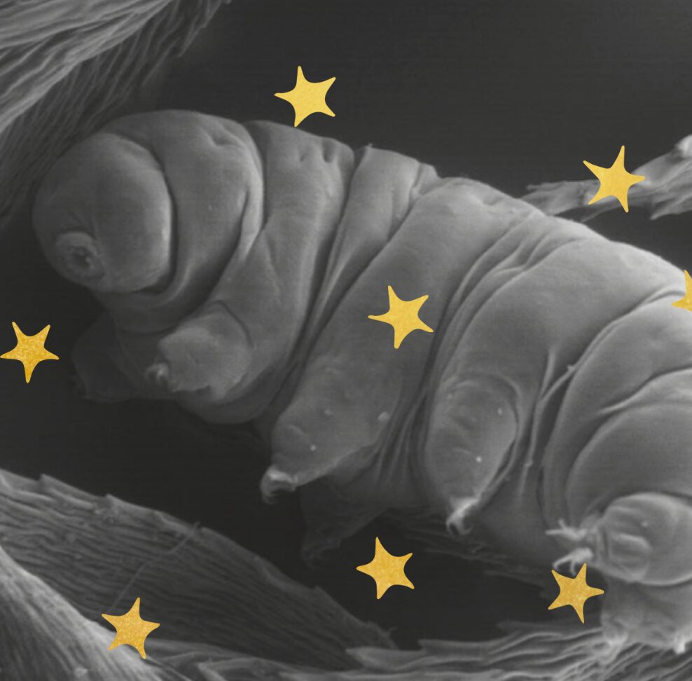 Bärtierchen sind Mikro-Organismen im Boden und das widerstandsfähigste Lebewesen auf unserem Planeten! Sie halten extreme Temperaturen aus: von +151 bis -273 Grad Celsius. Sie überleben auch kosmische Strahlung. Deshalb waren sie schon auf mehreren Weltraummissionen 😉